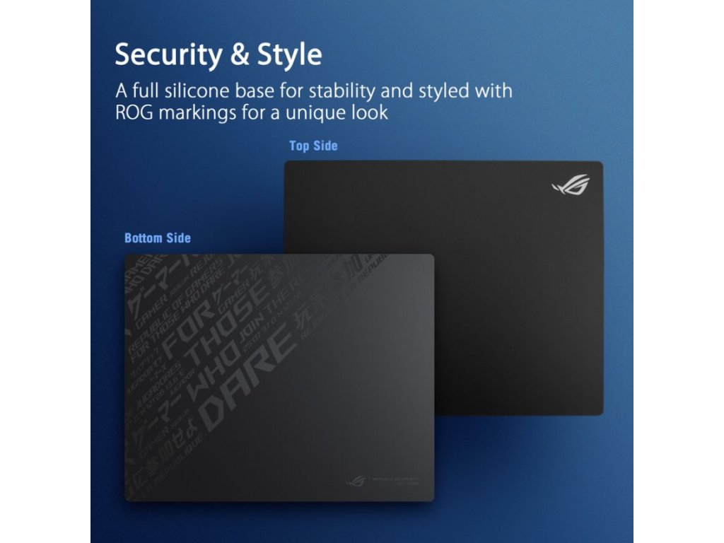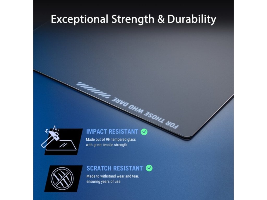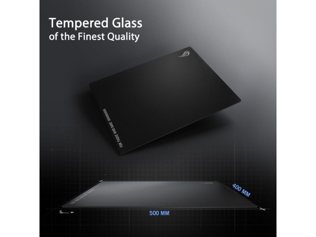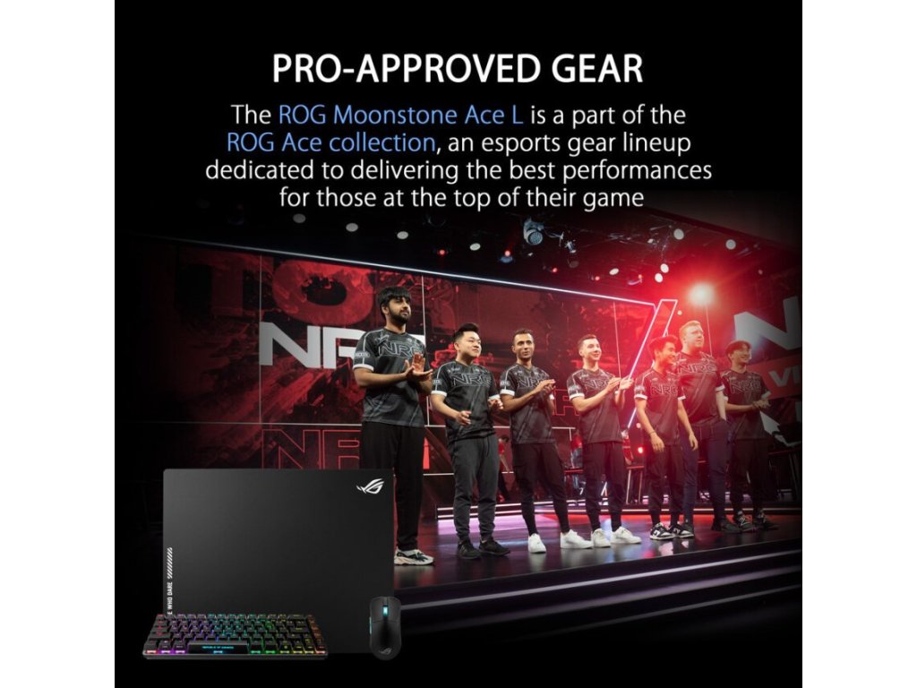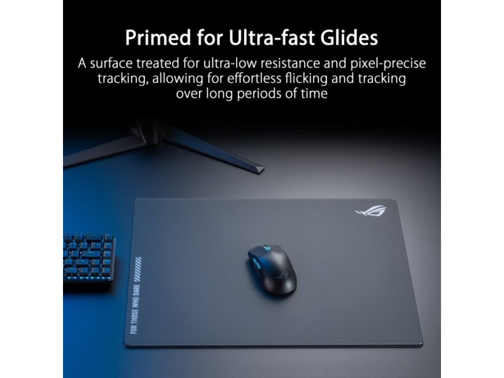 ROG Moonstone Ace L je velká herní podložka pod myš vyrobená z odolného tvrzeného skla s ultra hladkým povrchem optimalizovaným pro rychlé a konzistentní klouzání myši a protiskluzovou silikonovou základnou.