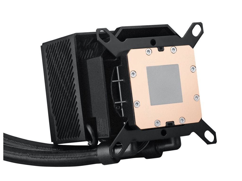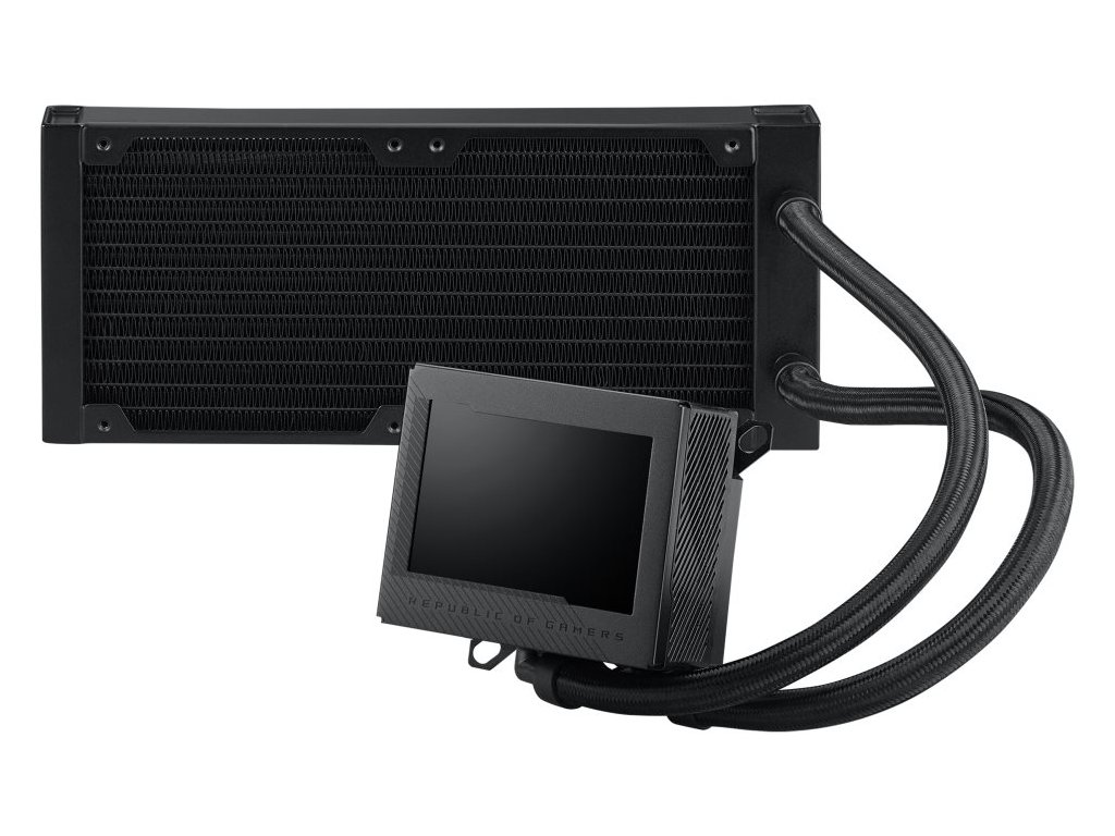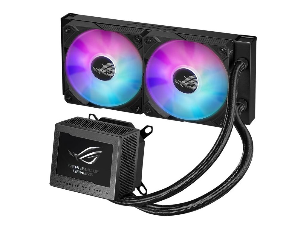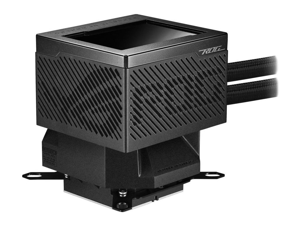 Velký 3,5" LCD displej zobrazuje aktuální údaje o systému, animované GIFy nebo dokonce vaše vlastní umělecká díla. Pod ním se nachází nové čerpadlo Asetek 8. generace, které je spojeno s většími chladicími trubicemi a udržuje procesory Intel a AMD v chladu, zatímco vestavěný ventilátor Axial-tech pomáhá řídit teplotu základní desky. A chladicí kapalina uvnitř proudí přes chladič, který zdobí dva ventilátory ROG 120mm ARGB, které se spojují pomocí magnetů.