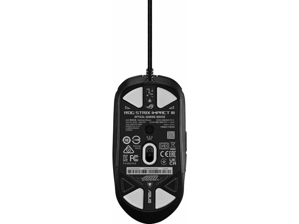 ROG Strix Impact III je lehká 59gramová drátová herní myš RGB s hmotností 59 gramů, vhodná pro hraní FPS, s optickým senzorem 12 000 dpi, téměř nulovou latencí kliknutí, vyměnitelnými zásuvkami pro přepínač myši, přepínači ROG Micro Mouse, ROG Paracord, 100% PTFE nožky myši a odolný design.