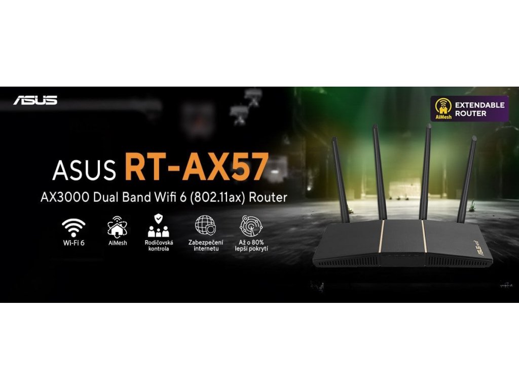 ASUS RT-AX57 (AX3000) dvoupásmový rozšiřitelný router WiFi 6, zabezpečení sítě bez předplatného, okamžitá ochrana, pokročilá rodičovská kontrola, vestavěná VPN, kompatibilní s AiMesh, hraní a streamování, chytrá domácnost.