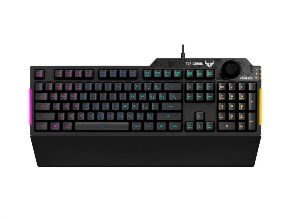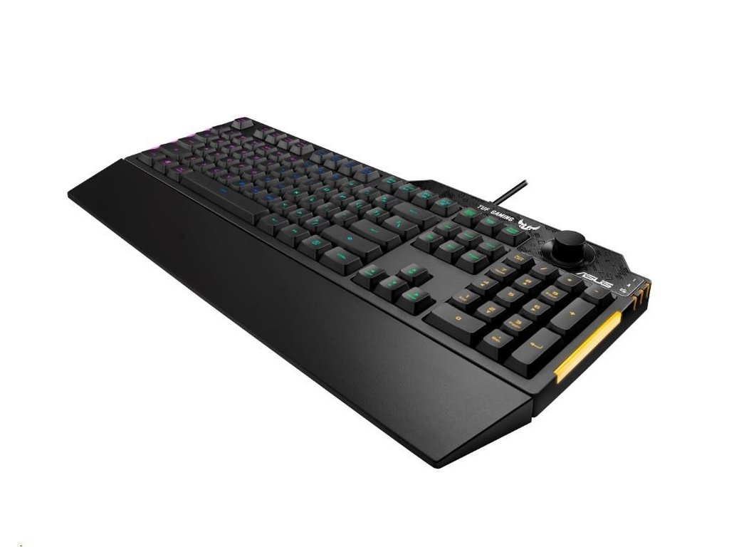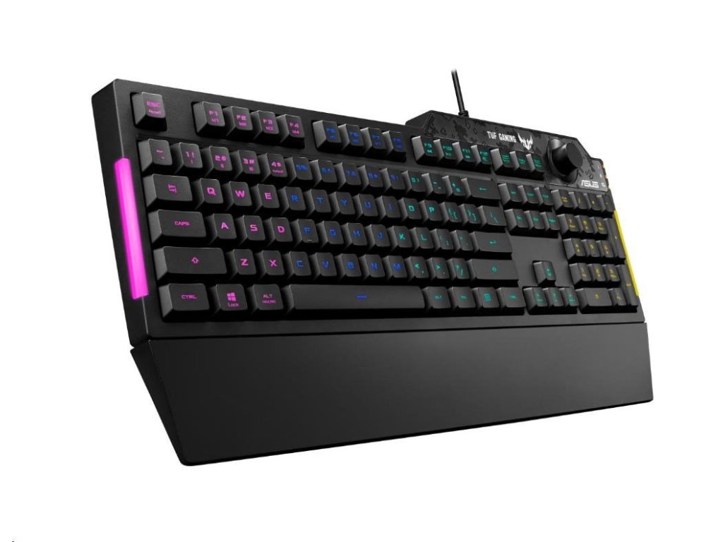 herní klávesnice, ASUS TUF Gaming K1 RGB s vyhrazeným knoflíkem hlasitosti, odolností proti polití, bočním světelným pruhem a Armory Crate, rozložení US