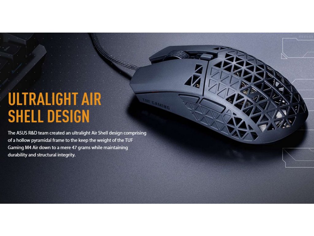 Lehká drátová herní myš, snímač 16.000 dpi, 6 programovatelných tlačítkek, ultralehký plášť Air Shell, voděodolnost IPX6, antibakteriální ochrana, šňůrka TUF Gaming Paracord, podložky z čistého teflonu.