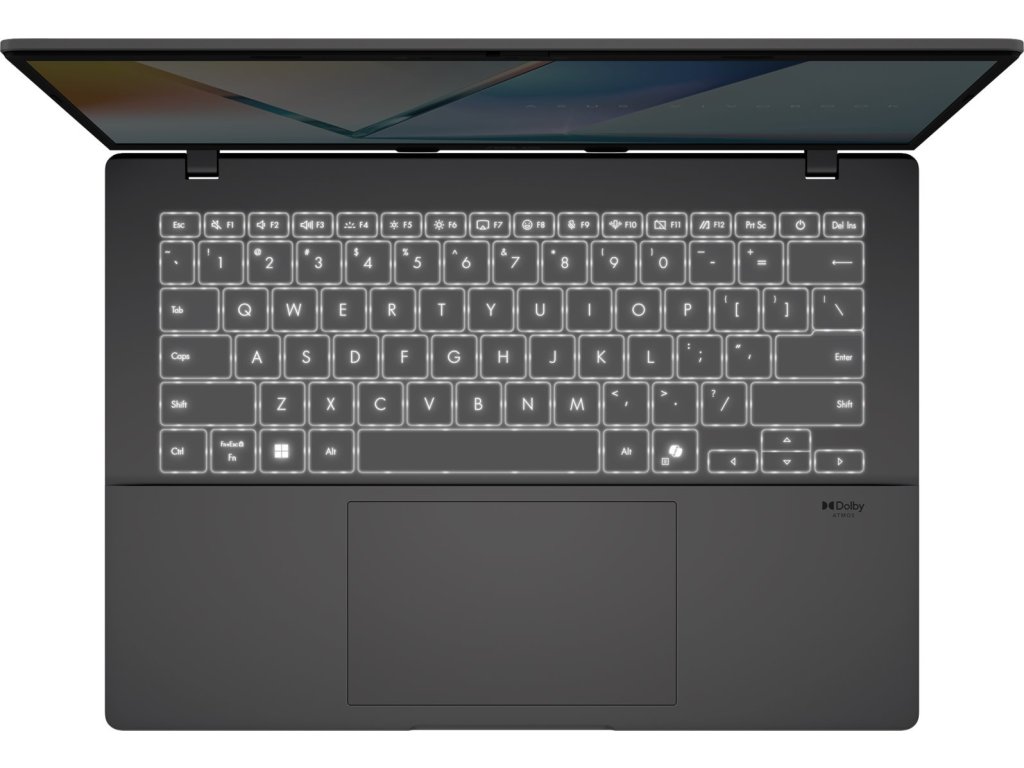 Displej: 14" FHD (1920x1200) OLED 16:10, lesklý, 60Hz, 0,2ms, 300 nitů, DCI-P3 95%, kontrastní poměr 1 000 000:1, 1,07 miliardy barev, 70% méně škodlivého modrého světla, certifikace TÜV Rheinland, poměr obrazovky k tělu 86%