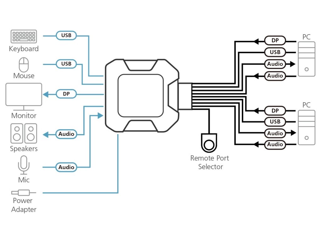 S CS-22DP můžete rychle a bez námahy přepínat mezi dvěmi počítači s obrazem DisplayPort pomocí tlačítka pro volbu vzdáleného portu na externím selektoru.
