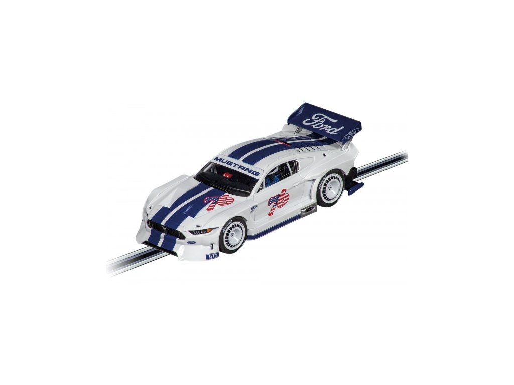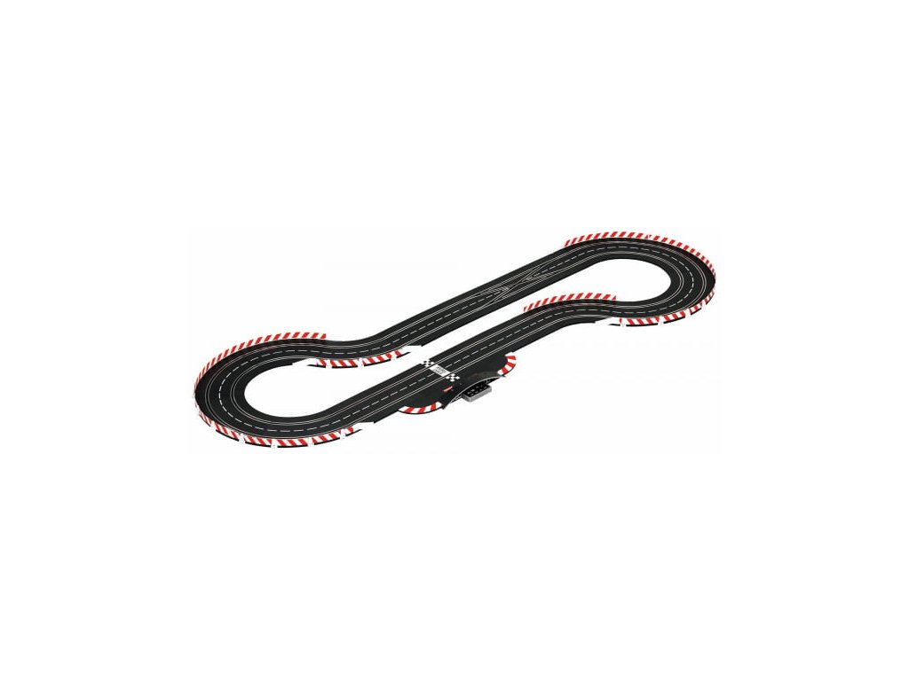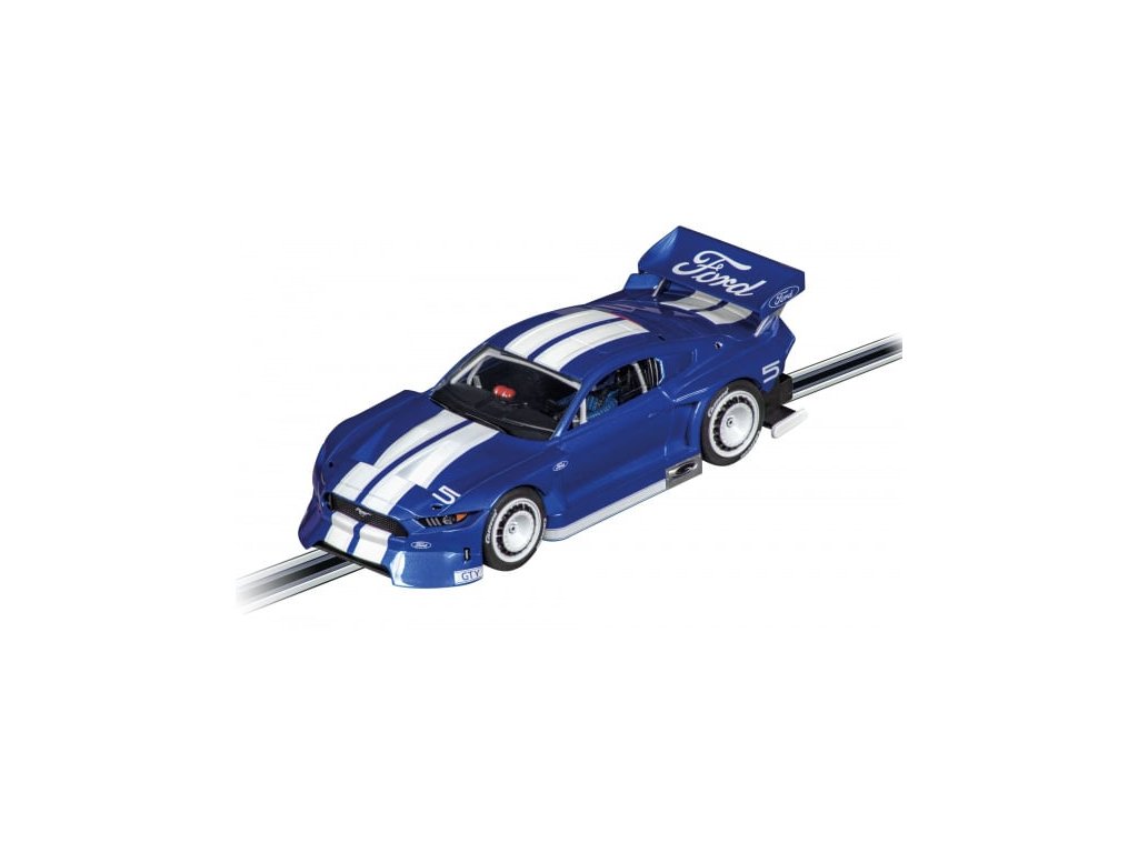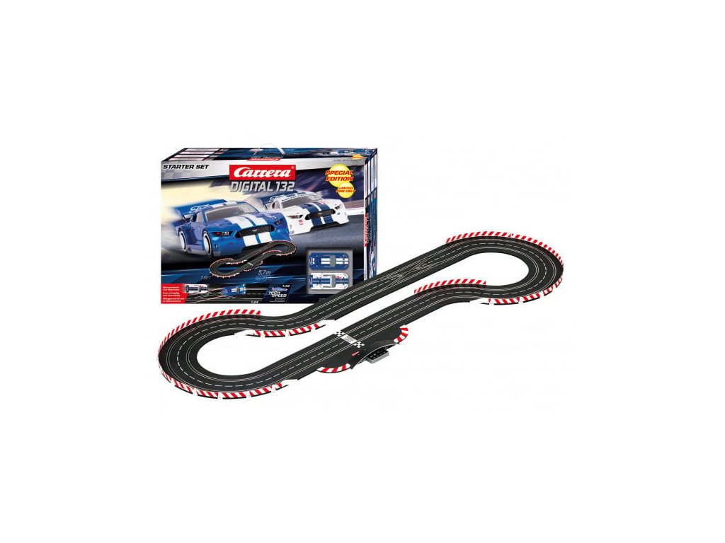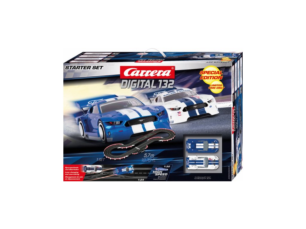 Autodráha Carrera Digital 132 dlouhá 5,7 m s auty Ford Mustang GTY obsahuje rovinky, zatáčky, díl na předjíždění zleva a zprava, napájecí díl a další díly.