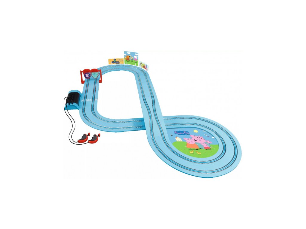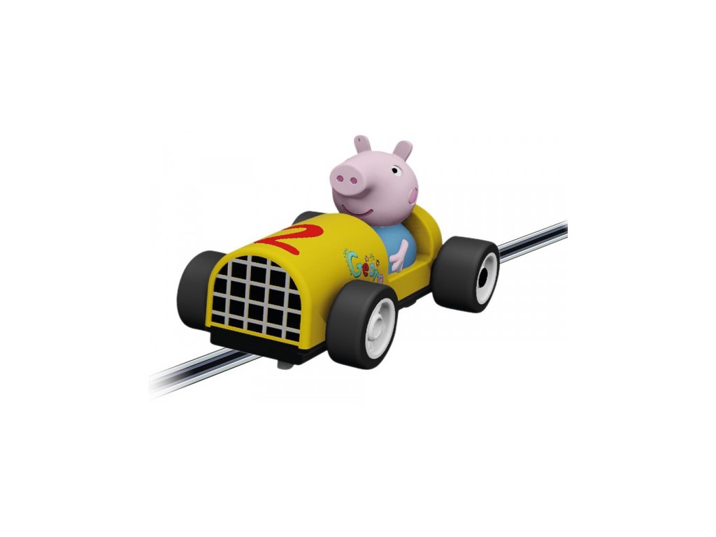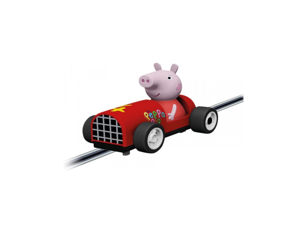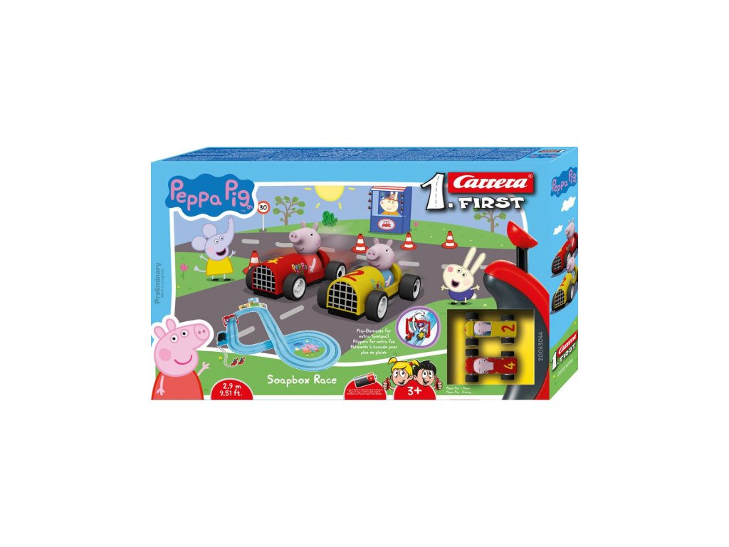 Autodráha Carrera FIRST dlouhá 2,9m s auty ze seriálu Prasátko Pepa (Peppa Pig), pro děti od 3 let, na baterie, obsahuje zúžení dráhy, rovinky, zatáčky, točící bránu, ovladače a dekorace s tématikou Prasátko Peppa.