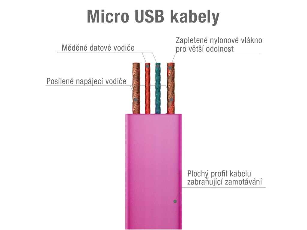Kabel USB A - Micro USB vhodný pro nabíjení a přenos dat, 40cm, plochý, růžová