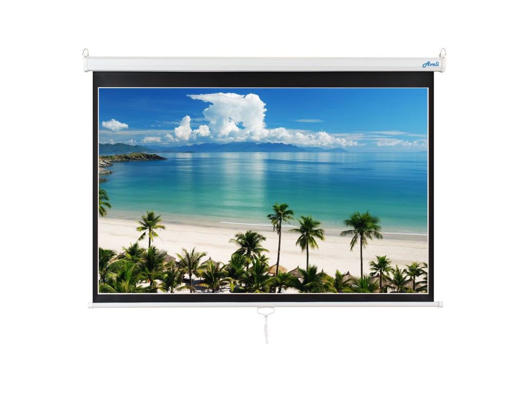 Nástěnné projekční plátno AVELI je možné instalovat na zeď nebo strop. Plátno je matně bílé s černým orámováním s formátem 16:10.