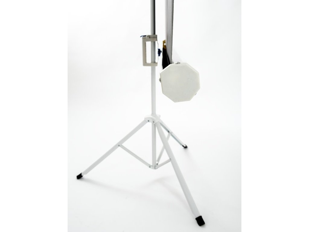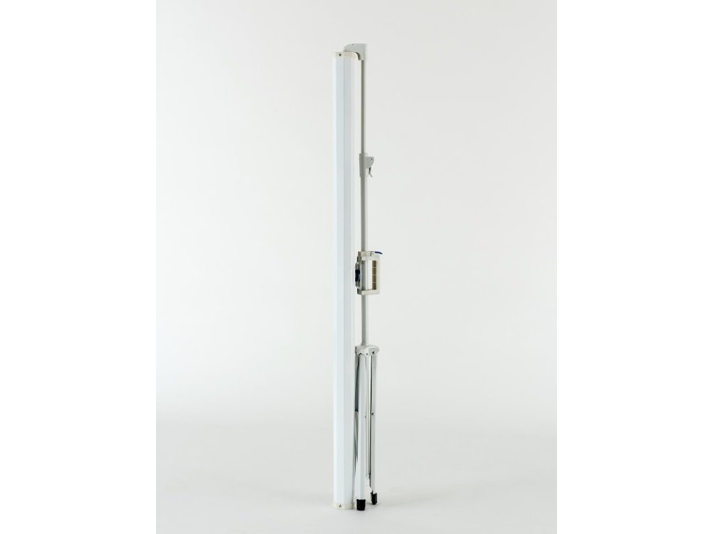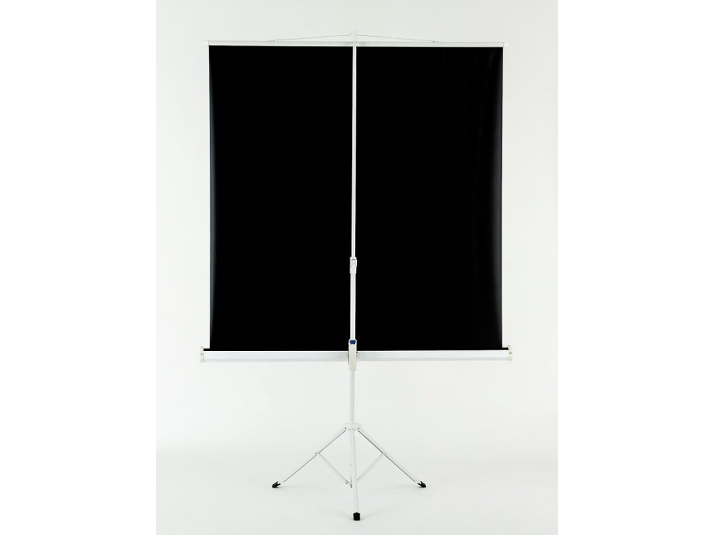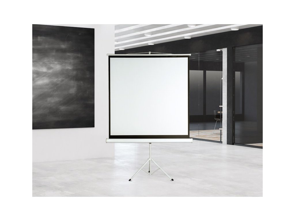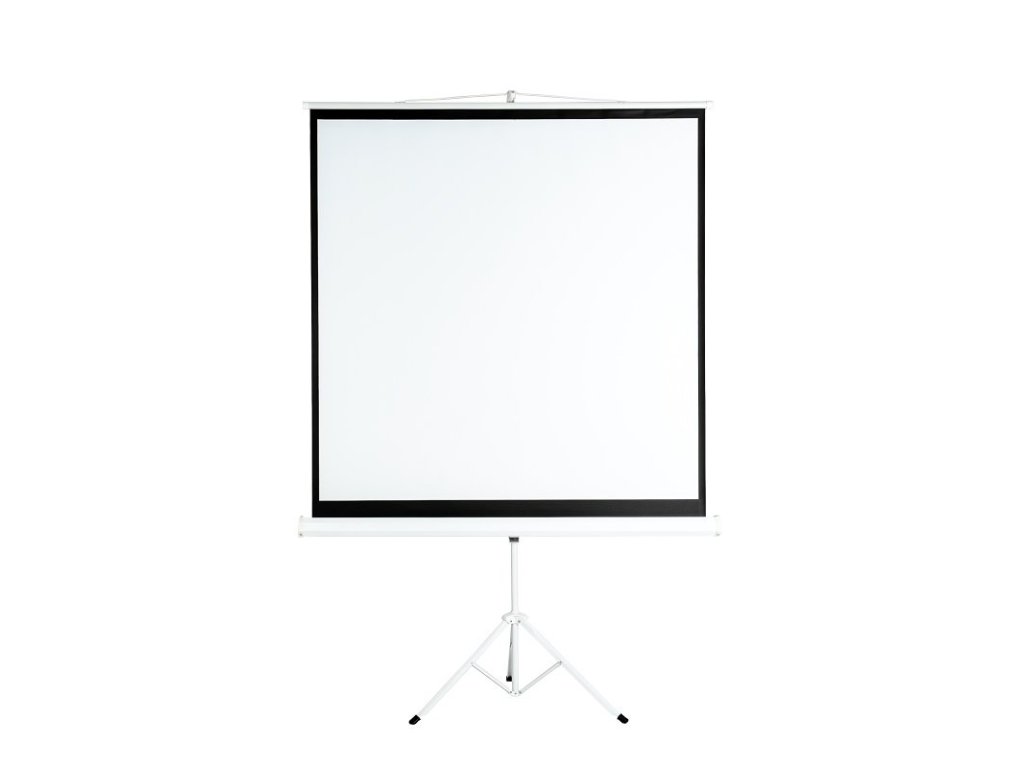 Mobilní stativové projekční plátno AVELI má stabilní základ na třech nohách. Plátno je matně bílé s černým orámováním s formátem 1:1.