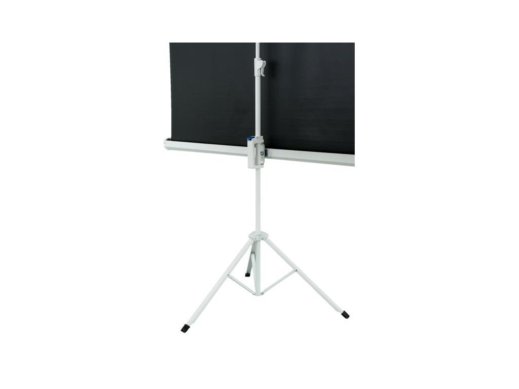 Mobilní stativové projekční plátno AVELI má stabilní základ na třech nohách. Plátno je matně bílé s černým orámováním s formátem 16:9.