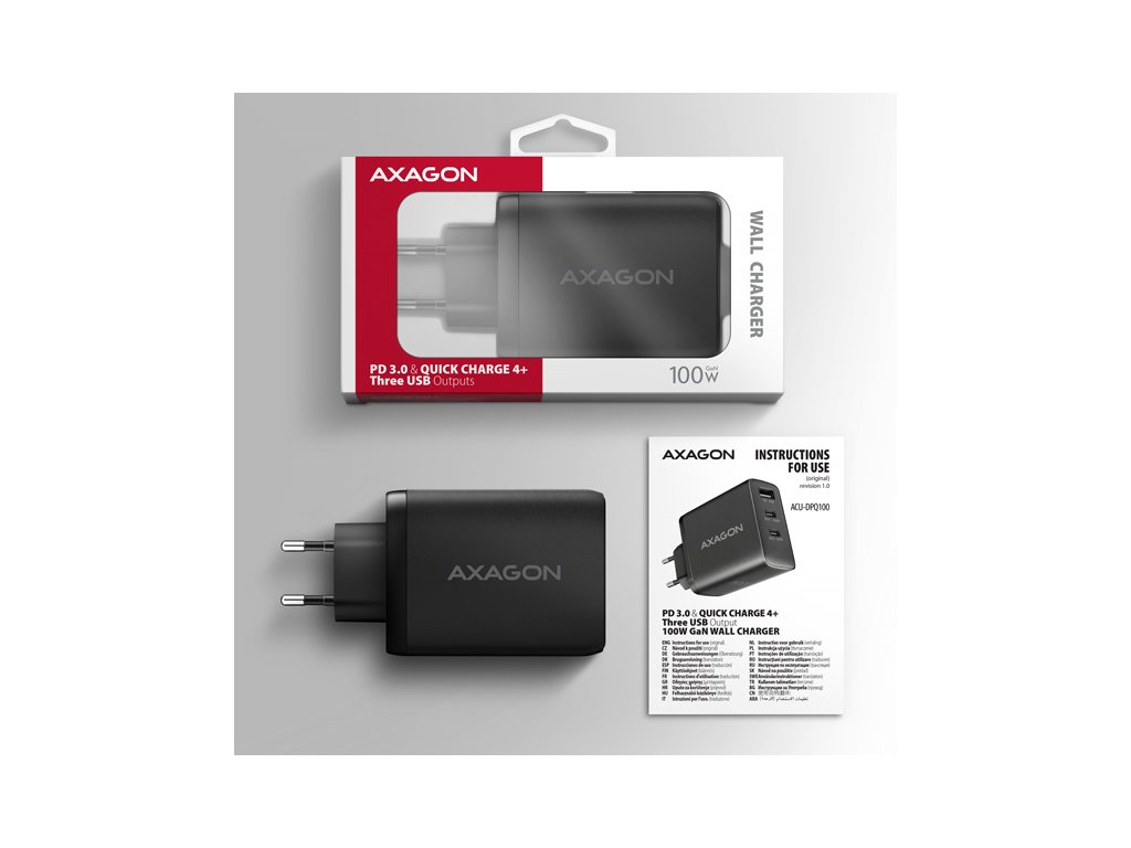 AXAGON ACU-DPQ100, GaN nabíječka do sítě 100W, 3x port (USB-A + dual USB-C), PD3.0/PPS/QC4+/Apple