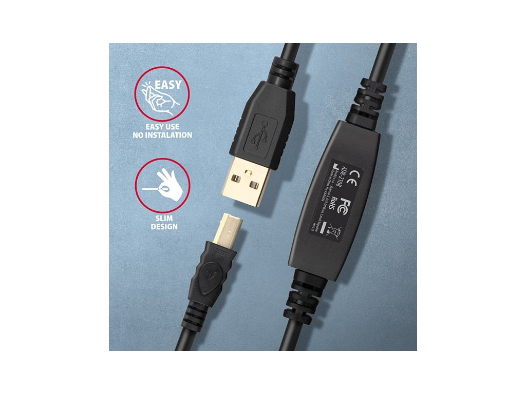 Aktivním propojovacím USB 2.0 kabelem AXAGON ADR-210B délky 10 metrů budete moci připojit např. tiskárnu, skener, plotr nebo další USB-B zařízení k Vašemu počítači. Aktivní USB repeater kabel zesiluje průchozí signál a umožnuje připojit USB-B zařízení na výrazně větší vzdálenost, než Vám umožní pasivní kabel. Dosah kabelu je možné dále prodloužit např. použitím prodlužovacího USB kabelu AXAGON ADR-210.