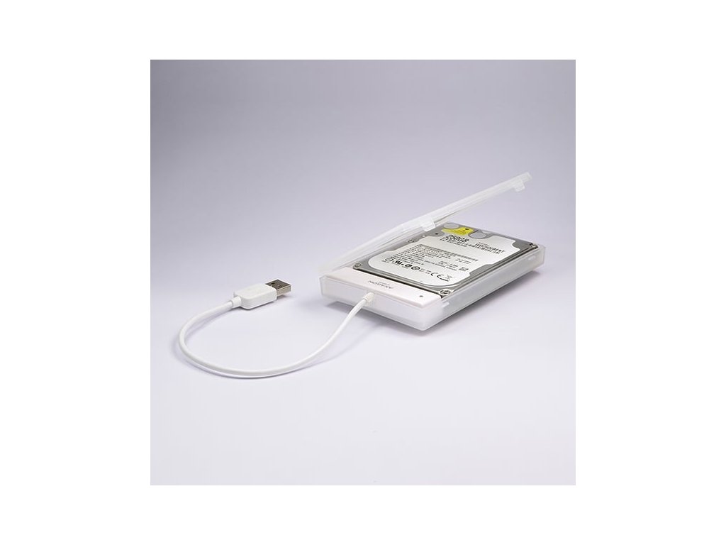jednoduché plastové pouzdro pojme 2.5" disk výšky max. 9.5mm s připojeným USB adaptérem (USB kabel je vyveden otvorem v pouzdře)