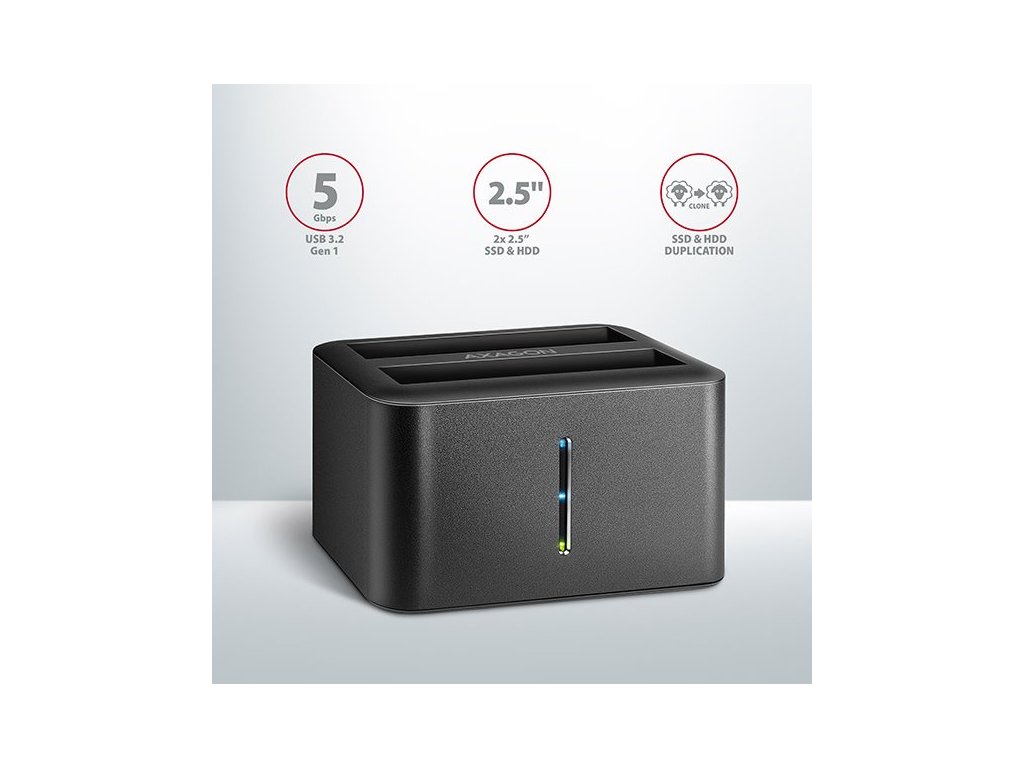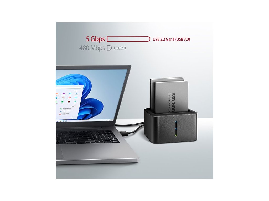 Duální USB 3.2 Gen 1 kompaktní dokovací stanice pro 2.5" SATA SSD/HDD. SATA 6G, UASP, funkce klonování, 1m kabel.