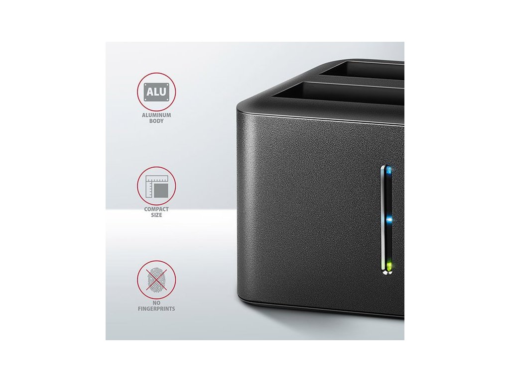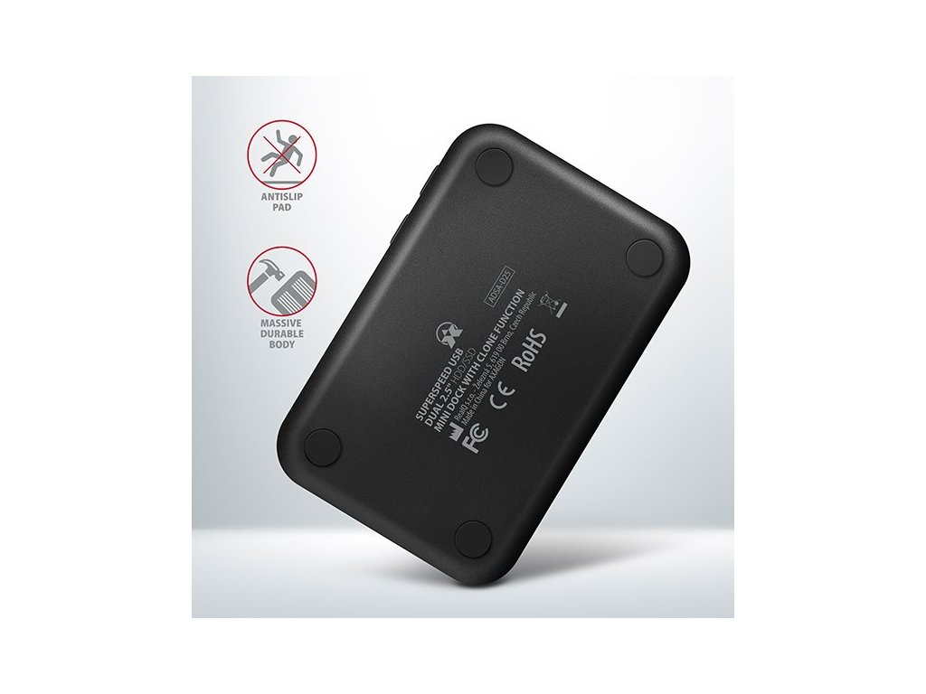 Dokovací stanici také využijete pro snadné klonování obsahu připojených disků bez potřeby připojení k PC. Do prvního slotu stanice HDD A (source) zasunete zdrojový disk a do druhého slotu HDD B (target) zasunete cílový. Pak jen zmáčknete klonovací tlačítko a sledujete průběh klonování na stupnici čtyř LED diod. Po zkopírování všech dat je na cílovém disku přesná kopie původního disku. Dock tak lze využít jako autonomní zařízení pro pohodlné duplikování a vytváření obrazů disků. Jedná se o nejjednodušší způsob, jak přenést obsah například starého HDD disku na nový SSD disk, a to včetně funkčního operačního systému (Windows, macOS, Linux …).