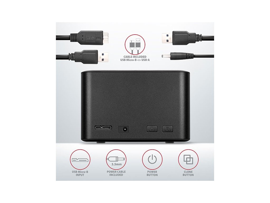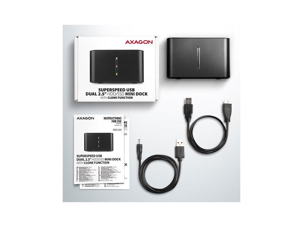 SuperSpeed USB 5 Gbps dokovací / klonovací stanice AXAGON ADSA-D25 CLONE MINI připojí k počítači snadno a rychle až dva 2.5" disky současně. Připojení k počítači umožňuje USB Micro-B konektor na doku spolu s dodávaným kabelem USB Micro-B <-> USB-A.
