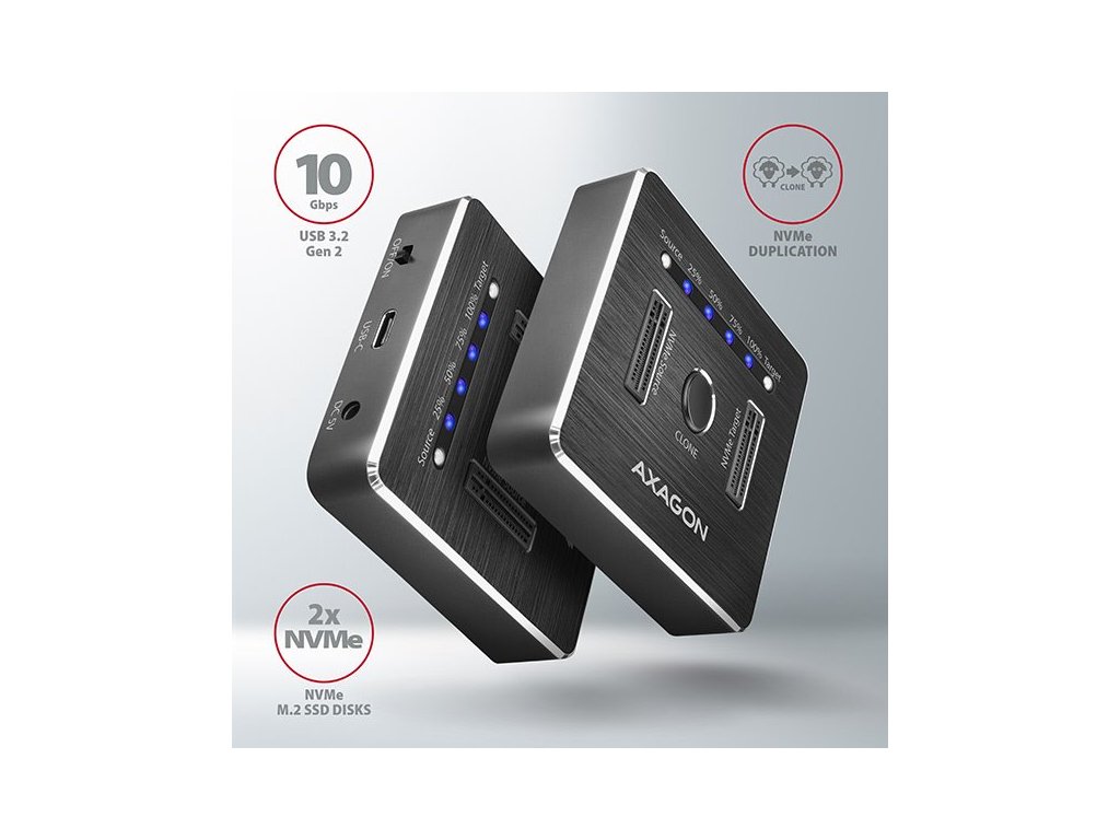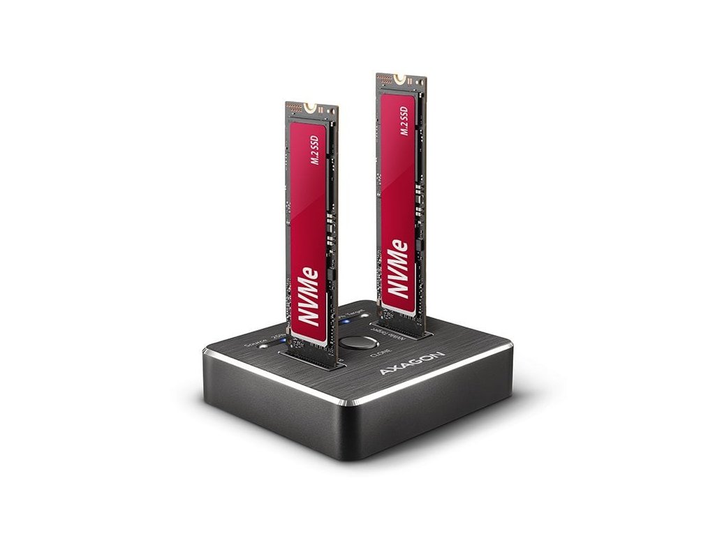 Dokovací stanici také využijete pro snadné klonování obsahu připojených NVMe disků bez potřeby připojení k PC. Do prvního slotu stanice (source) zasunete zdrojový M.2 disk a do druhého slotu (target) zasunete cílový M.2 disk. Pak jen zmáčknete klonovací tlačítko a sledujete průběh klonování na stupnici ze čtyř LED diod. Po zkopírování všech dat je na cílovém disku přesná kopie původního M.2 disku. Dock tak lze využít jako autonomní zařízení pro pohodlné duplikování a vytváření obrazů disků. Jedná se o nejjednodušší způsob, jak přenést obsah jednoho SSD disku na další SSD disk, a to včetně funkčního operačního systému (Windows, macOS, Linux …).