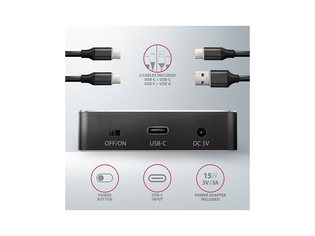 SuperSpeed USB-C 10 Gbps dokovací stanice AXAGON ADSA-M2C DUAL NVMe CLONE MASTER DOCK připojí k počítači snadno a rychle až dva NVMe (PCI-Express) M.2 SSD disky. Pohodlné připojení umožňuje oboustranný USB-C konektor. V balení naleznete rovnou dva kabely pro připojení dokovací stanice - klasický kabel USB-C -> USB-A a také USB-C -> USB-C kabel.