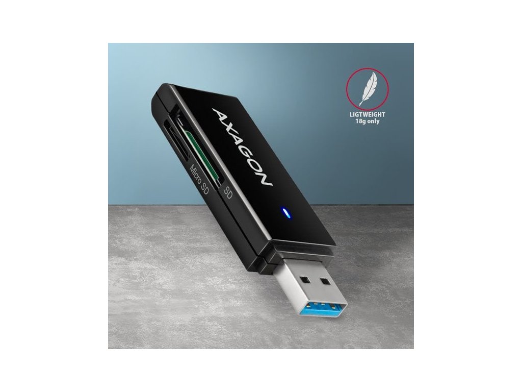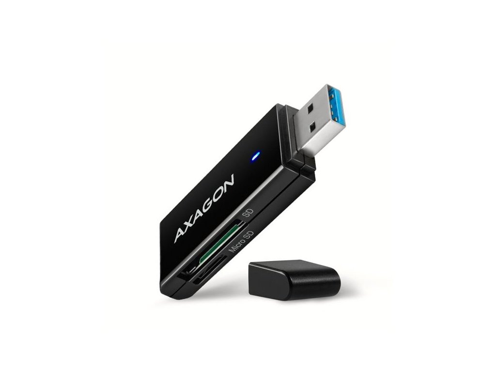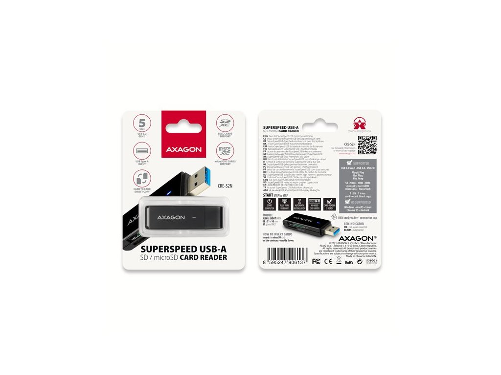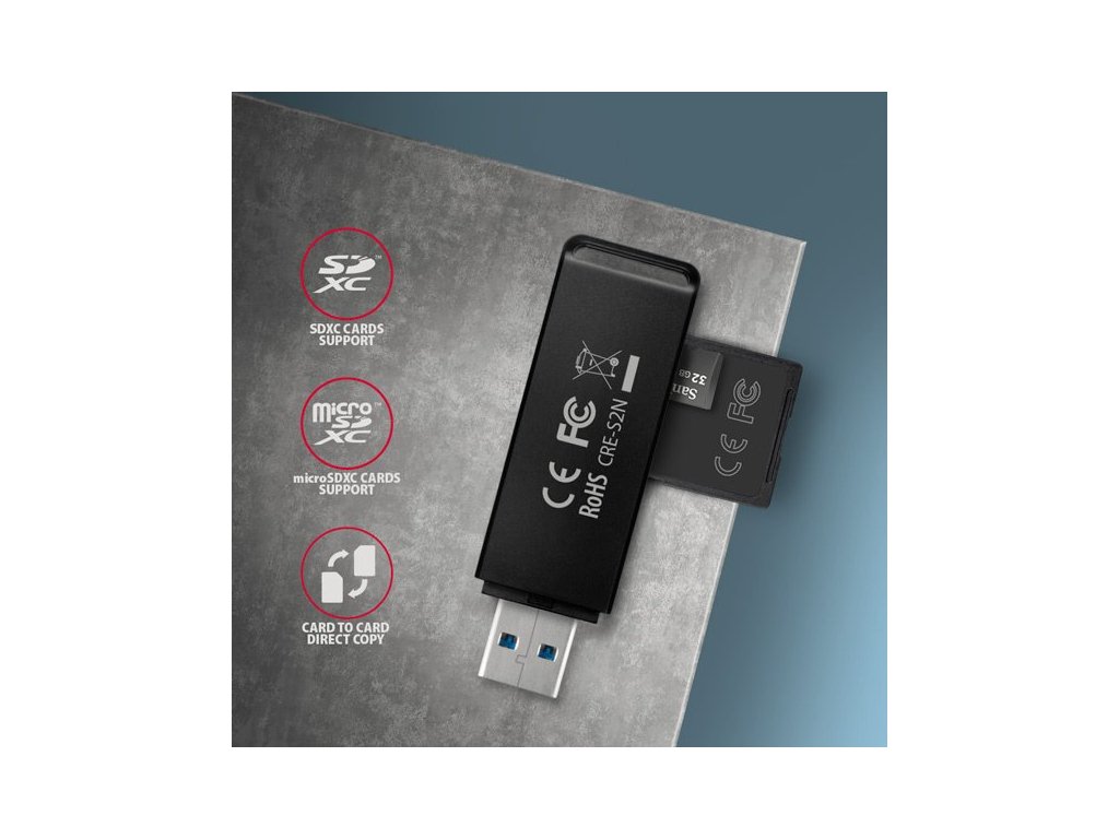 Štíhlá USB 3.2 Gen 1 čtečka paměťových karet AXAGON CRE-S2N SUPERSPEED podporuje všechny současné verze SD a microSD karet včetně SDXC a microSDXC s kapacitou až 2TB.