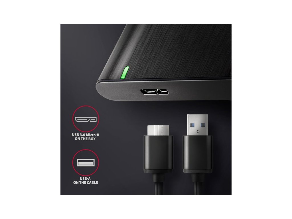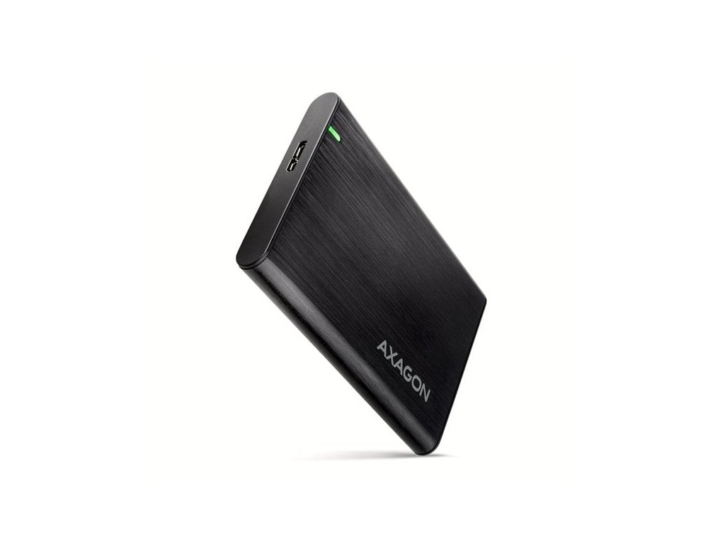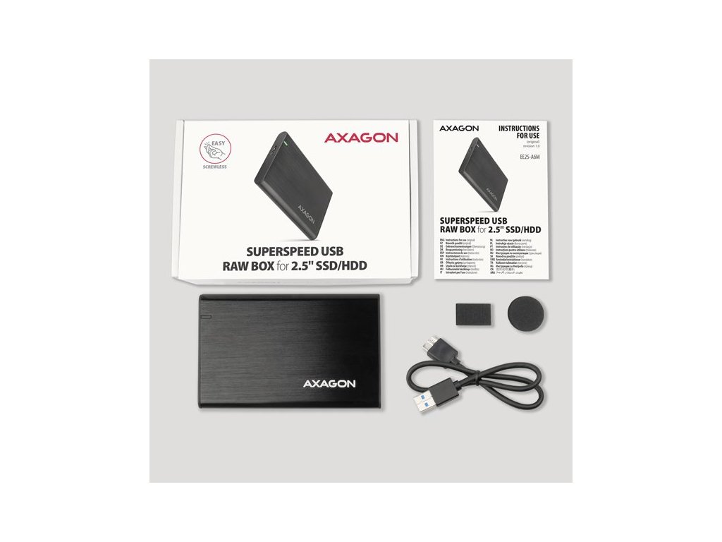 Bezšroubkový hliníkový externí AXAGON EE25-A6M RAW box s USB 3.2 Gen 1 (USB 3.0) rozhraním určený pro 2.5" SATA pevné disky nebo SSD. Připojení k počítači umožňuje USB Micro-B konektor na boxu spolu s dodávaným kabelem USB Micro-B -> USB-A.