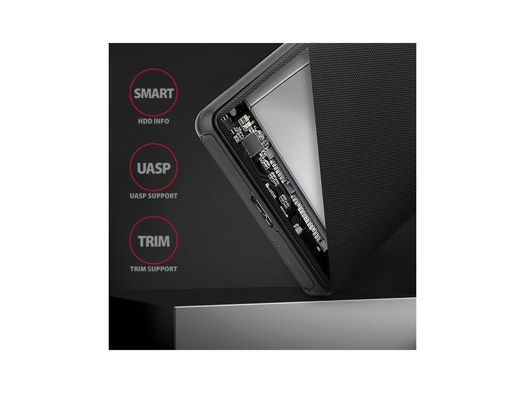 SATA 6G rozhraní s podporou UASP dovolí užívat si rychlost moderních SSD disků. Podpora funkce TRIM pro omeze-ní pozvolné degradace výkonu SSD v čase. Čtení S.M.A.R.T. informací monitorujících kondici externího disku. Podpora uspávání připojeného disku i boxu.