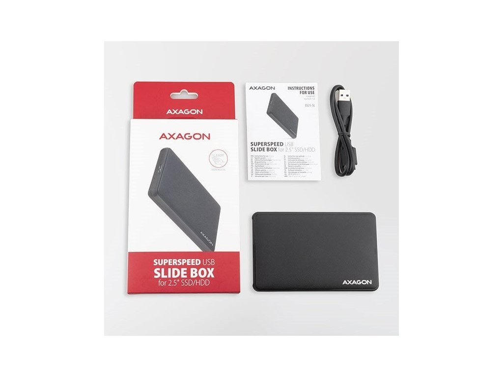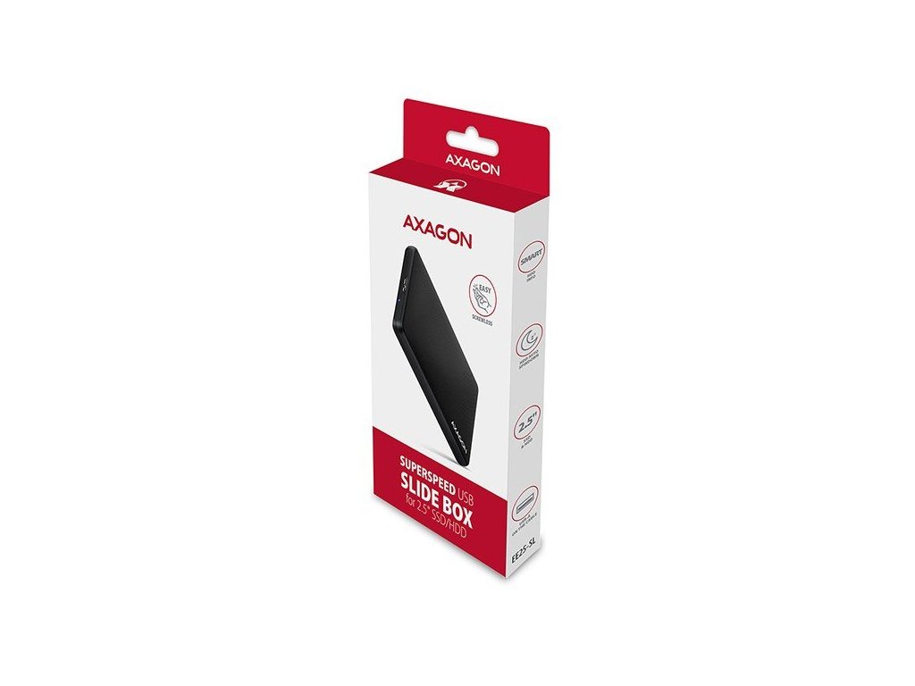 Lehký bezšroubkový externí AXAGON EE25-SL SLIDE BOX s USB 3.2 Gen 1 (USB 3.0) a SATA 6G rozhraním je určen pro všechny 2.5" SATA pevné disky nebo SSD.