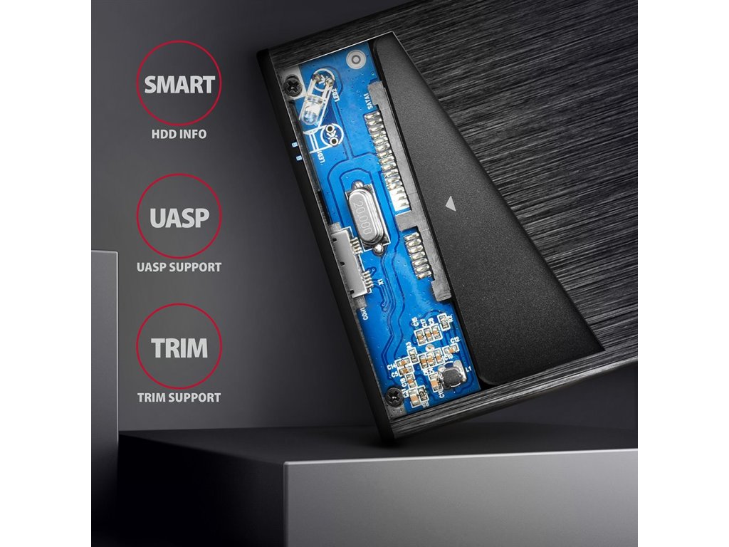 SATA 6G rozhraní s podporou UASP dovolí užívat si rychlost moderních SSD disků. Podpora funkce TRIM pro omezení pozvolné degradace výkonu SSD v čase. Čtení S.M.A.R.T. informací monitorujících kondici externího disku. Podpora uspávání připojeného disku i boxu.
