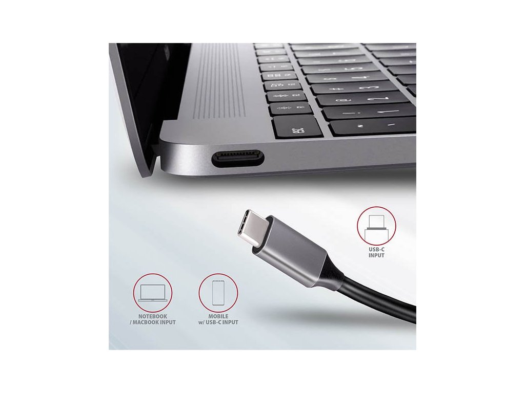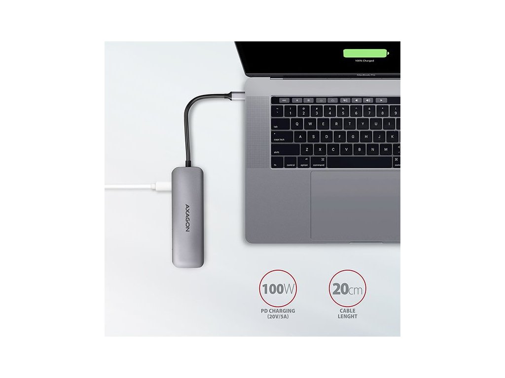USB-C konektor je vyhrazen pouze pro napájení a současné dobíjení telefonů nebo notebooků pomocí technologie Power Delivery 3.0 výkonem až 100W. Do hubu zapojíte USB-C Power Delivery nabíječku a hub připojíte k notebooku. Tím také uvolníte jeden USB-C port. Podmínkou je notebook s podporou nabíjení z USB-C portu pomocí Power Delivery a vhodná PD nabíječka.