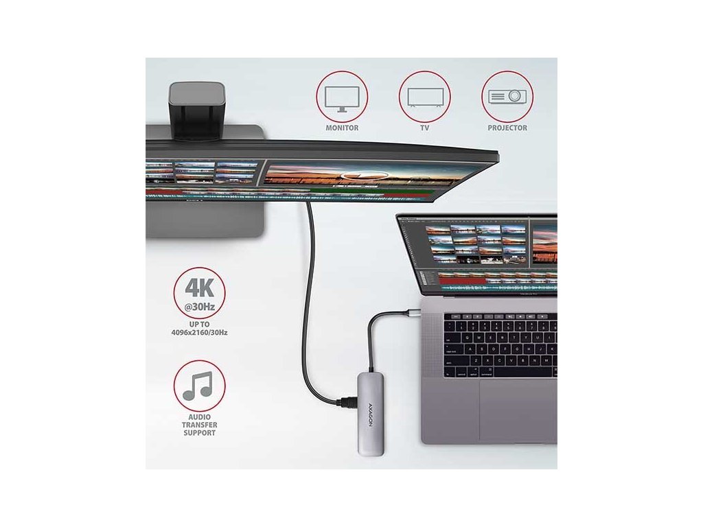 HDMI výstup poskytuje kvalitní obraz až do rozlišení 4K/30Hz Ultra HD a podporuje přenos vícekanálového zvuku. Podporována jsou také oblíbená hráčská rozlišení WQHD 2560 x 1440 při 60Hz nebo FullHD 1920 x 1080 při 60, 100 a 120Hz max. Pro správné fungování video výstupu je nutné, aby USB-C port notebooku podporoval DisplayPort Alternate Mode (DP Alt Mode) nebo Thunderbolt 3.
