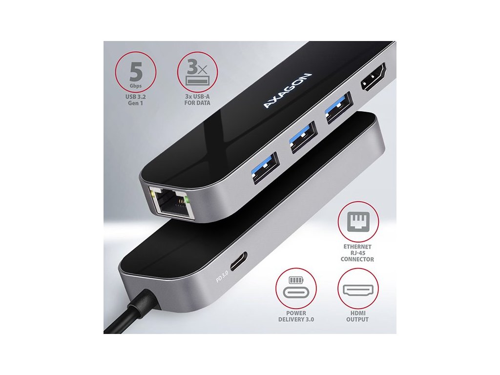 Multiportový USB-C 3.2 Gen 1 hub AXAGON HMC-6GL rozšíří Váš notebook, počítač nebo telefon o šest portů. Přes oboustranný USB-C konektor snadno a rychle připojíte k počítači až tři USB zařízení, Gigabitovou ethernet síť a HDMI zobrazovač současně. Zároveň získáte možnost napájení notebooku pomocí technologie Power Delivery. USB-C hub vám tak poskytne jednoduchou a skladnou dokovací stanici 6v1 k notebooku jako je například MacBook Pro.