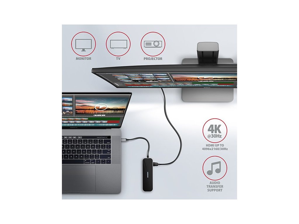 HDMI výstup poskytuje kvalitní obraz až do rozlišení 4K/30Hz Ultra HD a podporuje přenos vícekanálového zvuku. Podporována jsou také oblíbená hráčská rozlišení WQHD 2560 x 1440 při 60Hz nebo FullHD 1920 x 1080 při 60, 100 a 120Hz max. Pro správné fungování video výstupu je nutné, aby USB-C port notebooku podporoval DisplayPort Alternate Mode (DP Alt Mode) nebo Thunderbolt 3.