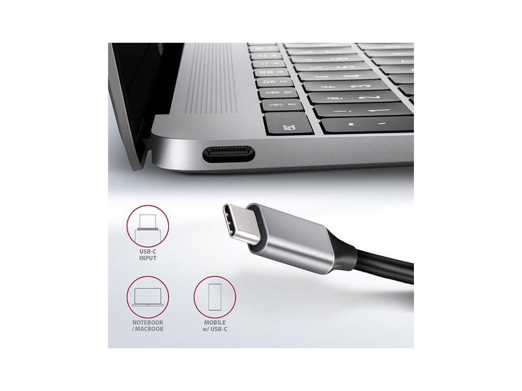 USB-C konektor je vyhrazen pouze pro napájení a současné dobíjení telefonů nebo notebooků pomocí technologie Power Delivery 3.0 výkonem až 100W. Do hubu zapojíte USB-C Power Delivery nabíječku a hub připojíte k notebooku. Tím také uvolníte jeden USB-C port. Podmínkou je notebook s podporou nabíjení z USB-C portu pomocí Power Delivery a vhodná PD nabíječka.