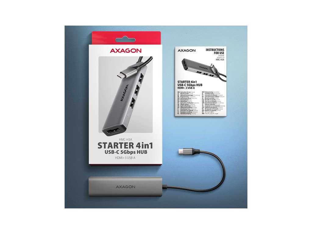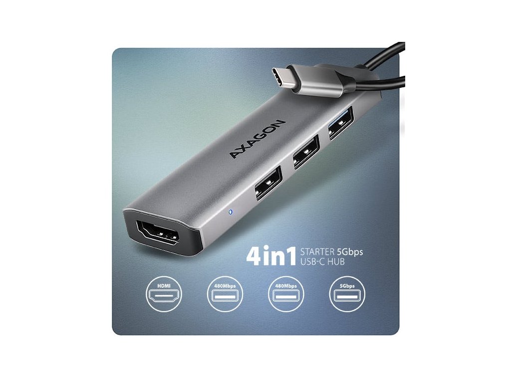 Multiportový USB-C 5Gbps AXAGON HMC-H3A STARTER 4in1 hub rozšíří Váš notebook, počítač nebo telefon o čtyři porty. Notebook připojíte k hubu přes 15 cm dlouhý USB-C kabel. Okamžitě tak máte k dispozici konektory pro připojení monitoru a tří USB zařízení současně.