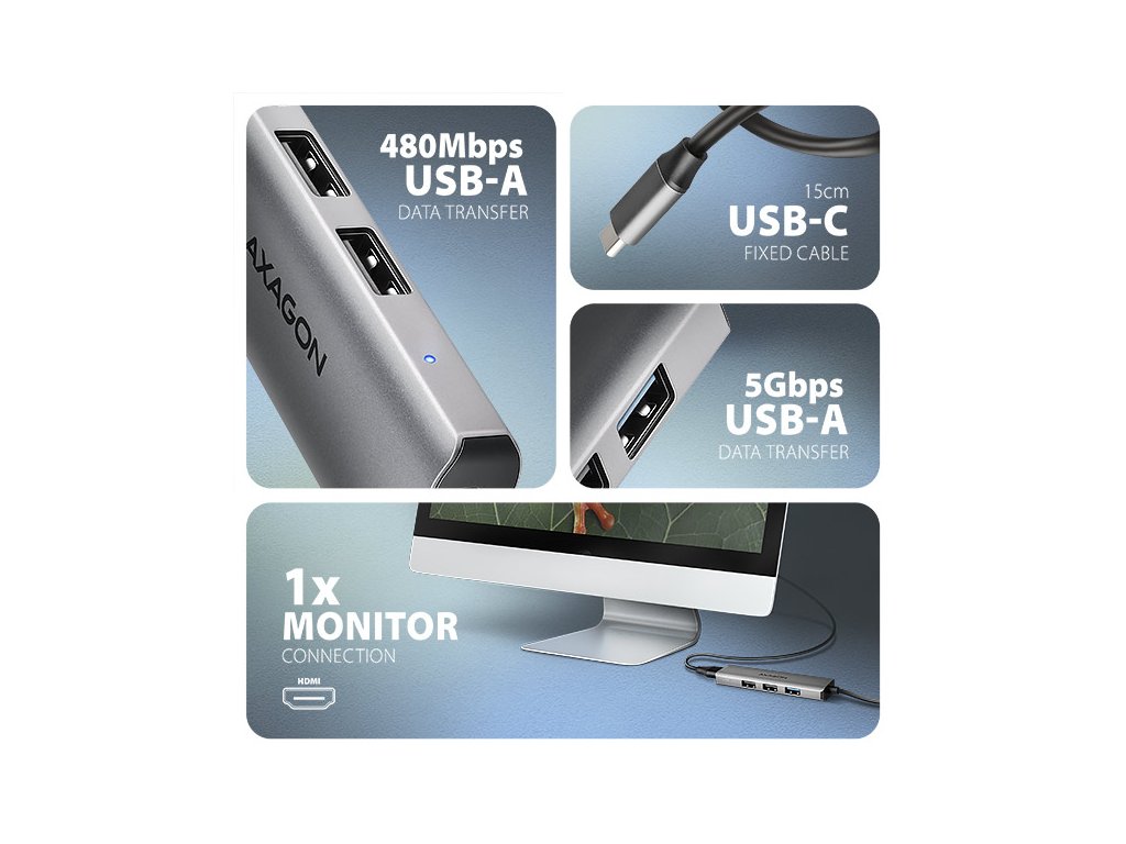 AXAGON HMC-H3A, USB 5Gbps hub, 3x USB-A, HDMI 4k/30Hz, kabel USB-C 15cm