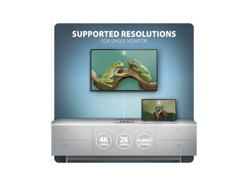 • 1 monitor - až 4K/30Hz Ultra HD, 2K/60Hz Quad HD, 1080p/120Hz Full HD.