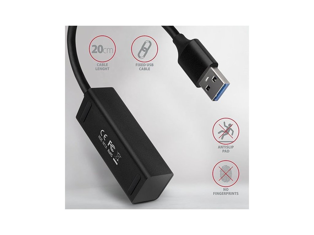 Miniaturní kovový USB 3.2 Gen 1 (USB 3.0) hub AXAGON HUE-M1A snadno a rychle připojí k notebooku nebo počítači až čtyři USB zařízení současně. Kovové tělo hubu je vyrobeno z hliníku a zajišťuje tak dokonalou mechanickou ochranu pro časté přenášení. Elegantní, jemně strukturovaný povrch brání nežádoucím otiskům. Gumové nožky zabraňují klouzání hubu po stole. Napevno uchycený USB kabel délky 20 cm je ideální pro uživatele mobilních zařízení.