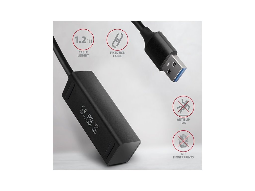 Miniaturní kovový USB 3.2 Gen 1 (USB 3.0) hub AXAGON HUE-M1AL s USB kabelem dlouhým 1.2m snadno a rychle připojí k počítači až čtyři USB zařízení současně. Kovové tělo hubu je vyrobeno z hliníku a zajišťuje tak dokonalou mechanickou ochranu. Elegantní, jemně strukturovaný povrch brání nežádoucím otiskům. Gumové nožky zabraňují klouzání hubu po stole. Napevno uchycený USB kabel délky 120 cm je vhodný pro použití se stolním počítačem.