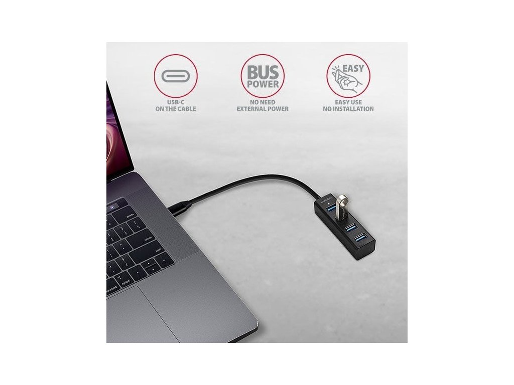Miniaturní kovový USB-C 3.2 Gen 1 hub AXAGON HUE-M1C snadno a rychle připojí k notebooku nebo počítači až čtyři USB zařízení současně. Kovové tělo hubu je vyrobeno z hliníku a zajišťuje tak dokonalou mechanickou ochranu pro časté přenášení. Elegantní, jemně strukturovaný povrch brání nežádoucím otiskům. Gumové nožky zabraňují klouzání hubu po stole. Napevno uchycený USB kabel délky 20 cm je ideální pro uživatele mobilních zařízení.