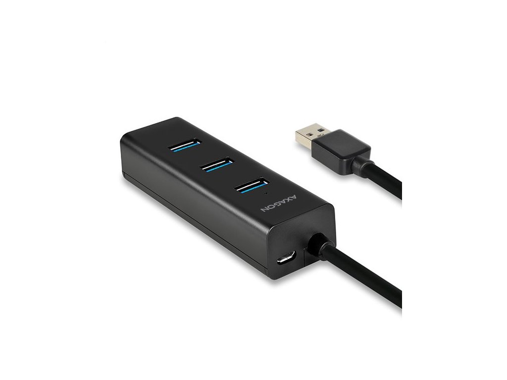 4-portový USB 3.0 hub AXAGON HUE-S2BL s USB kabelem dlouhým 1.2m, možností externího napájení a podporou rychlonabíjení na všech portech. Lehký malý rozbočovač s elegantním matným plastovým tělem připojí snadno a rychle k počítači až čtyři USB zařízení současně. Napevno uchycený 1.2 m dlouhý USB kabel je vhodný pro použití se stolním počítačem.