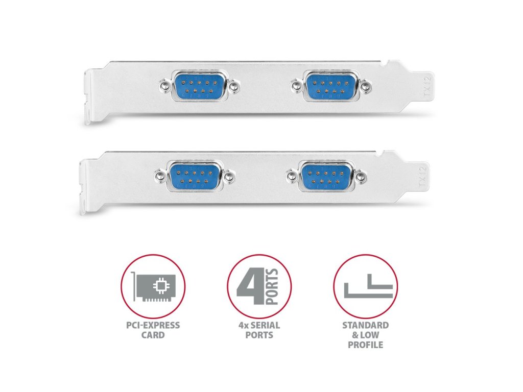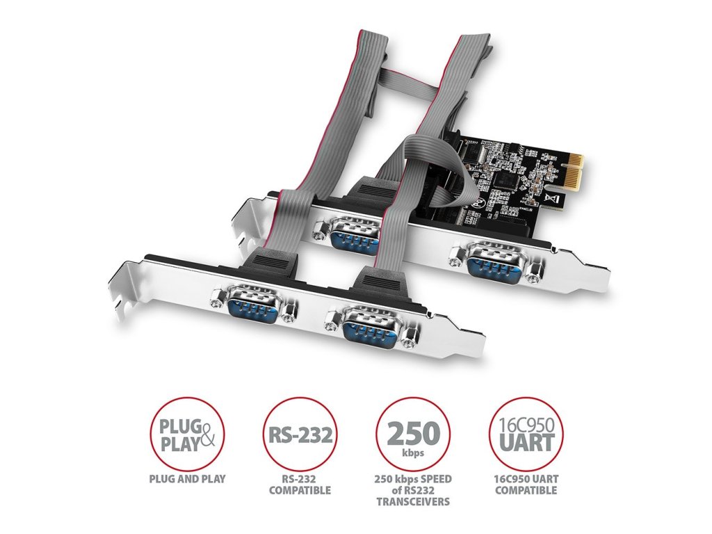 PCI-Express karta AXAGON PCEA-S4N rozšíří stolní počítač o čtyři sériové RS-232 porty s DB-9 konektory.