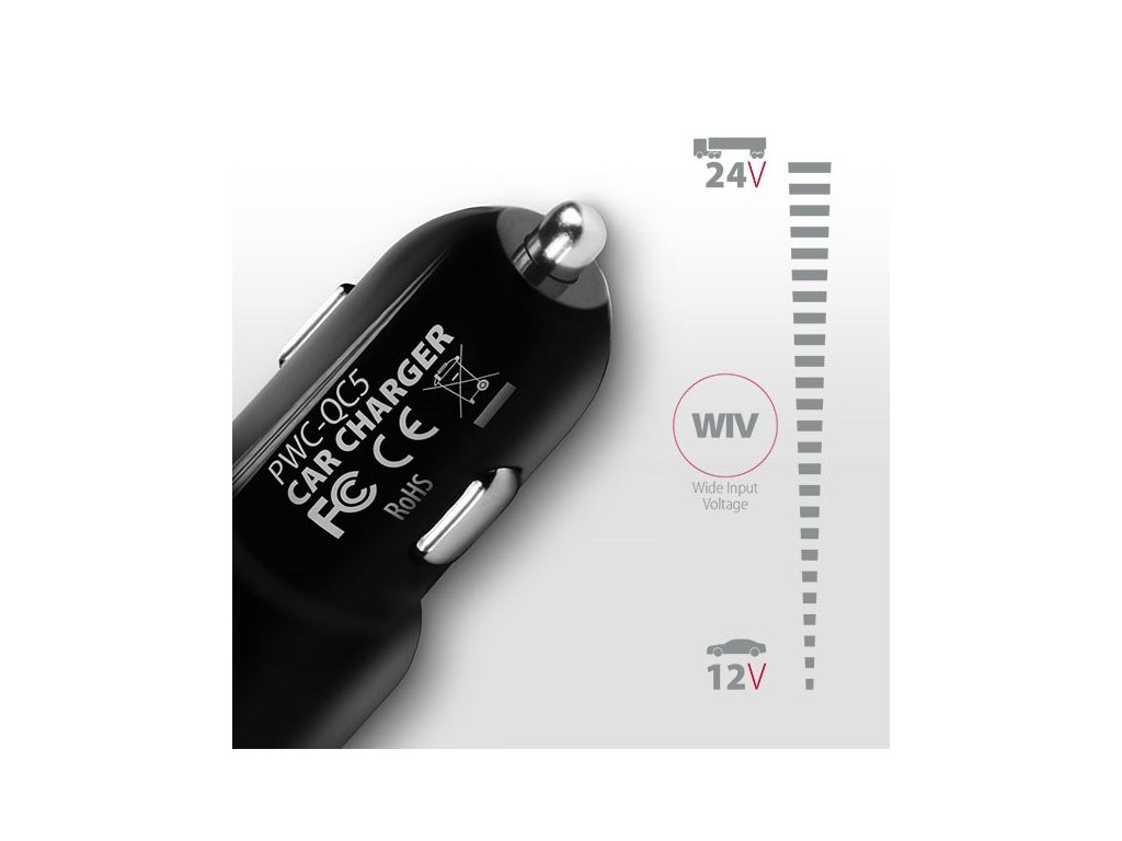 nabíječka do auta, CL konektor; duální autonabíječka 12-24V / 2x port QC3.0/FCP + 5V - 2.4A. Celkový výkon 31.5W.