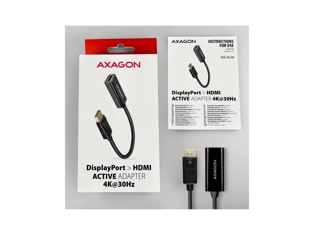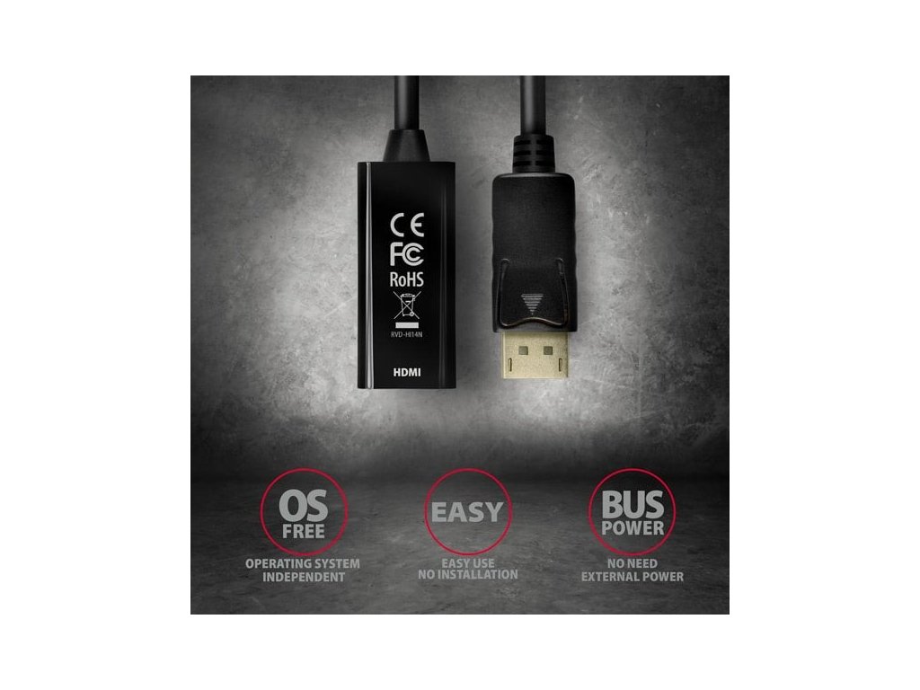 DisplayPort -> HDMI aktivní adaptér AXAGON RVD-HI14N pro připojení HDMI monitoru/TV/projektoru k počítači s výstupem DisplayPort.