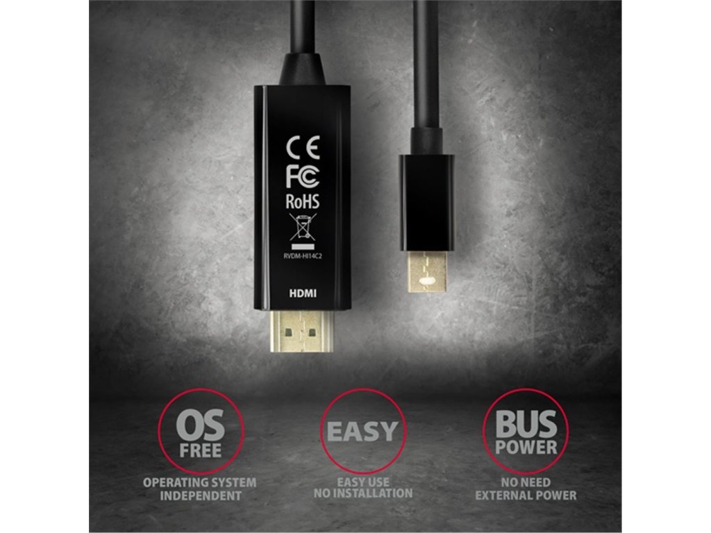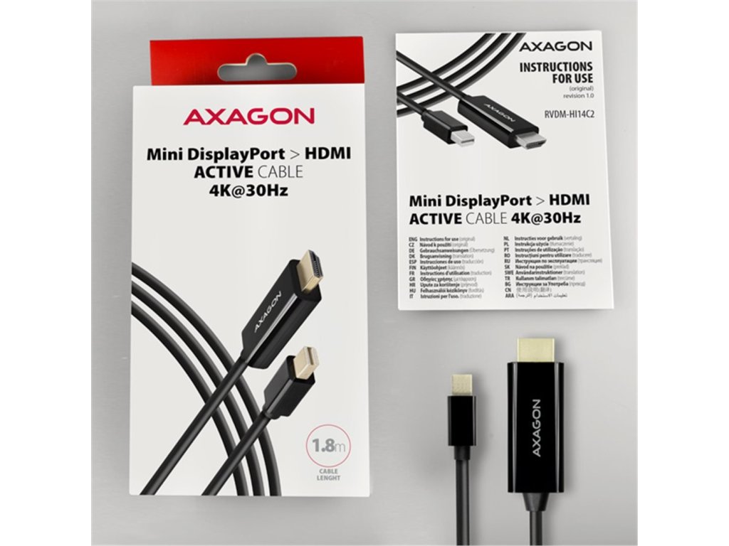 Mini DisplayPort -> HDMI aktivní kabel - redukce AXAGON RVDM-HI14C2 pro připojení HDMI monitoru/TV/projektoru k počítači s výstupem Mini DisplayPort.