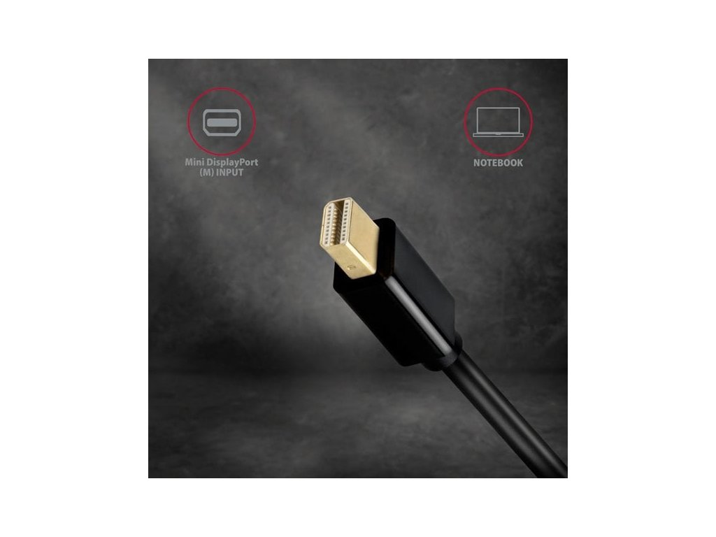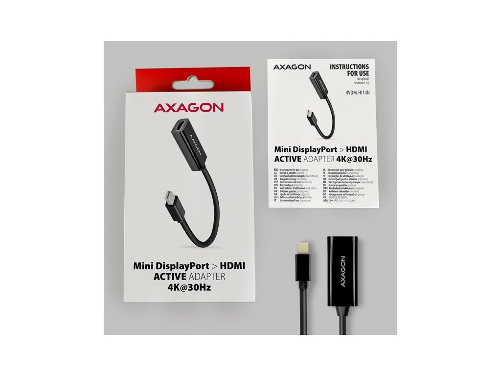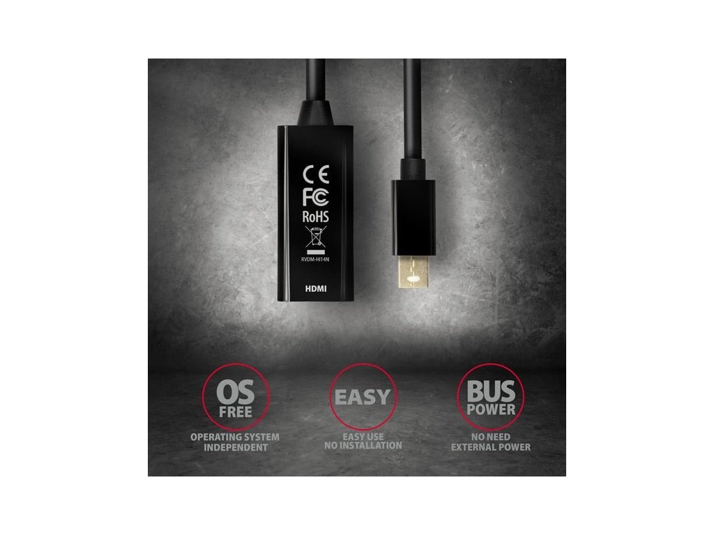 Mini DisplayPort -> HDMI aktivní adaptér AXAGON RVDM-HI14N pro připojení HDMI monitoru/TV/projektoru k počítači s výstupem Mini DisplayPort.
