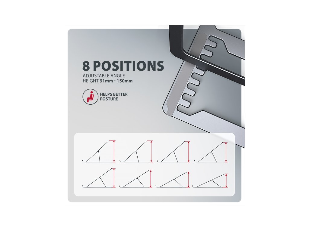 Velkou výhodou je možnost nastavení až osmi poloh. Díky tomu můžete notebook zvednout do výšky od 91 do 150 mm. Tím získáte další pracovní plochu ve správné úrovni očí, což výrazně zlepšuje ergonomii a pohodlí při práci, a zároveň zvyšuje vaši produktivitu.