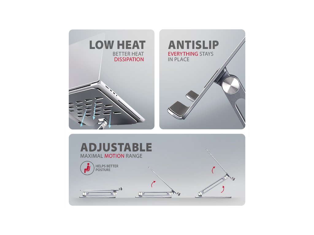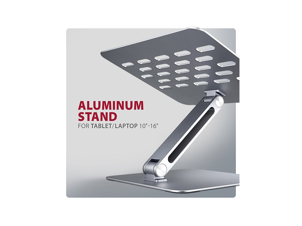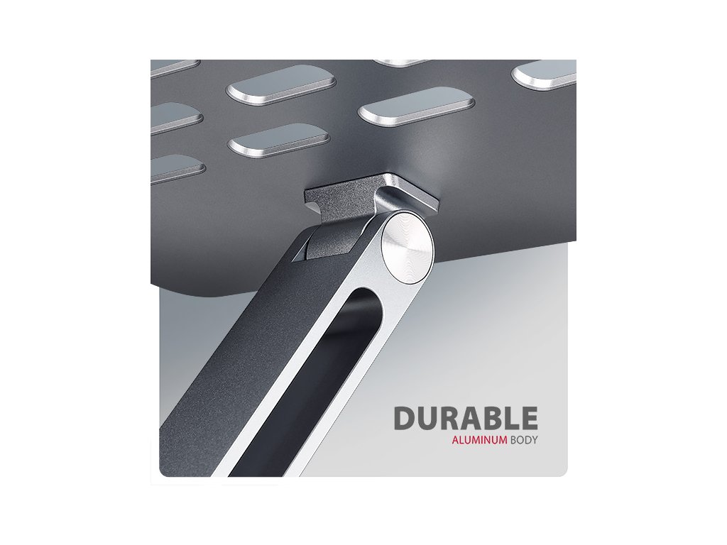 Podstavec je vyroben z robustních hliníkových odlitků garantujících dlouhou životnost a spolehlivost. Díky protiskluzové úpravě se nemusíte obávat nežádoucích pohybů – vaše zařízení zůstane pevně na svém místě, a to bez poškození povrchu notebooku či podložky. Tyto pečlivě navržené vlastnosti zaručují perfektní stabilitu pro váš notebook, tablet nebo dokonce oblíbenou knihu, což vám poskytne klid a pohodlí při každodenním používání.