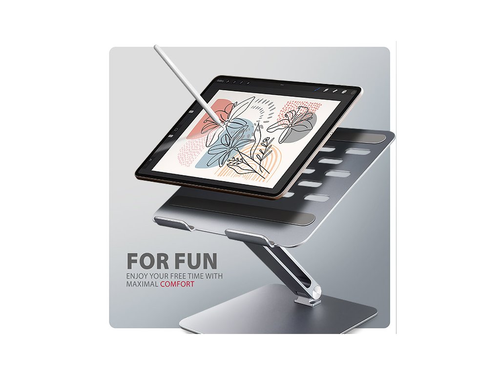 Stojan lze snadno složit do kompaktních rozměrů, což umožňuje pohodlné přenášení kamkoli potřebujete. Jeho elegantní design v šedé barvě nejen stylově doplní váš pracovní stůl, ale také přináší praktické funkce, které oceníte při každodenním používání.