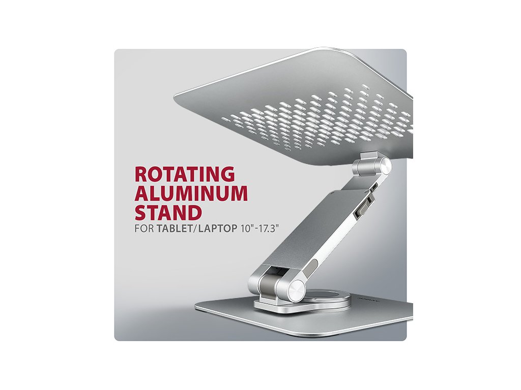 Hliníkový stojan s 360° rotací pro notebooky velikosti 10" - 17.3". Nastavitelná výška a úhel.