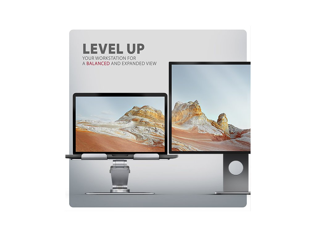 360° mechanismus umožňuje otočení celého ramene s notebookem okolo své osy. Tato funkce zajišťuje maximální flexibilitu – snadno změníte orientaci notebooku, aniž byste museli stojan přemisťovat. To oceníte zejména při práci v omezených prostorech, nebo při sdílení obrazovky notebooku při obchodních jednáních, poradách nebo prezentacích.