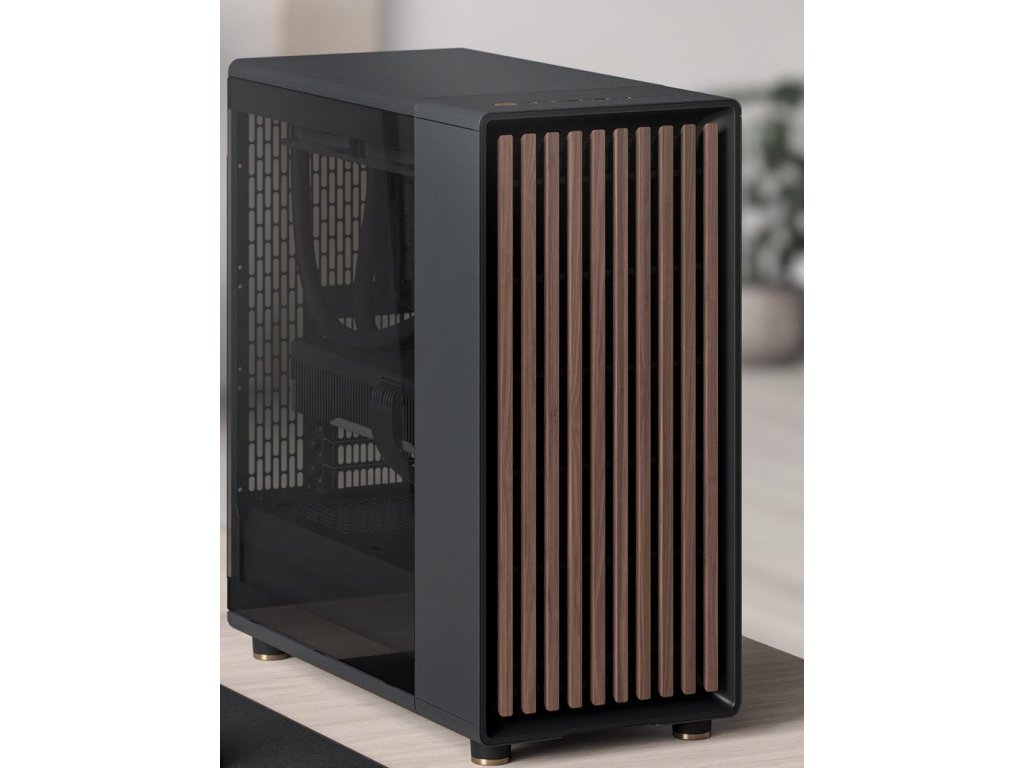 Prémiová skříň Fractal Design North: S elegantním černým provedením a mesh bočnicí pro optimální proudění vzduchu a minimalistický vzhled.